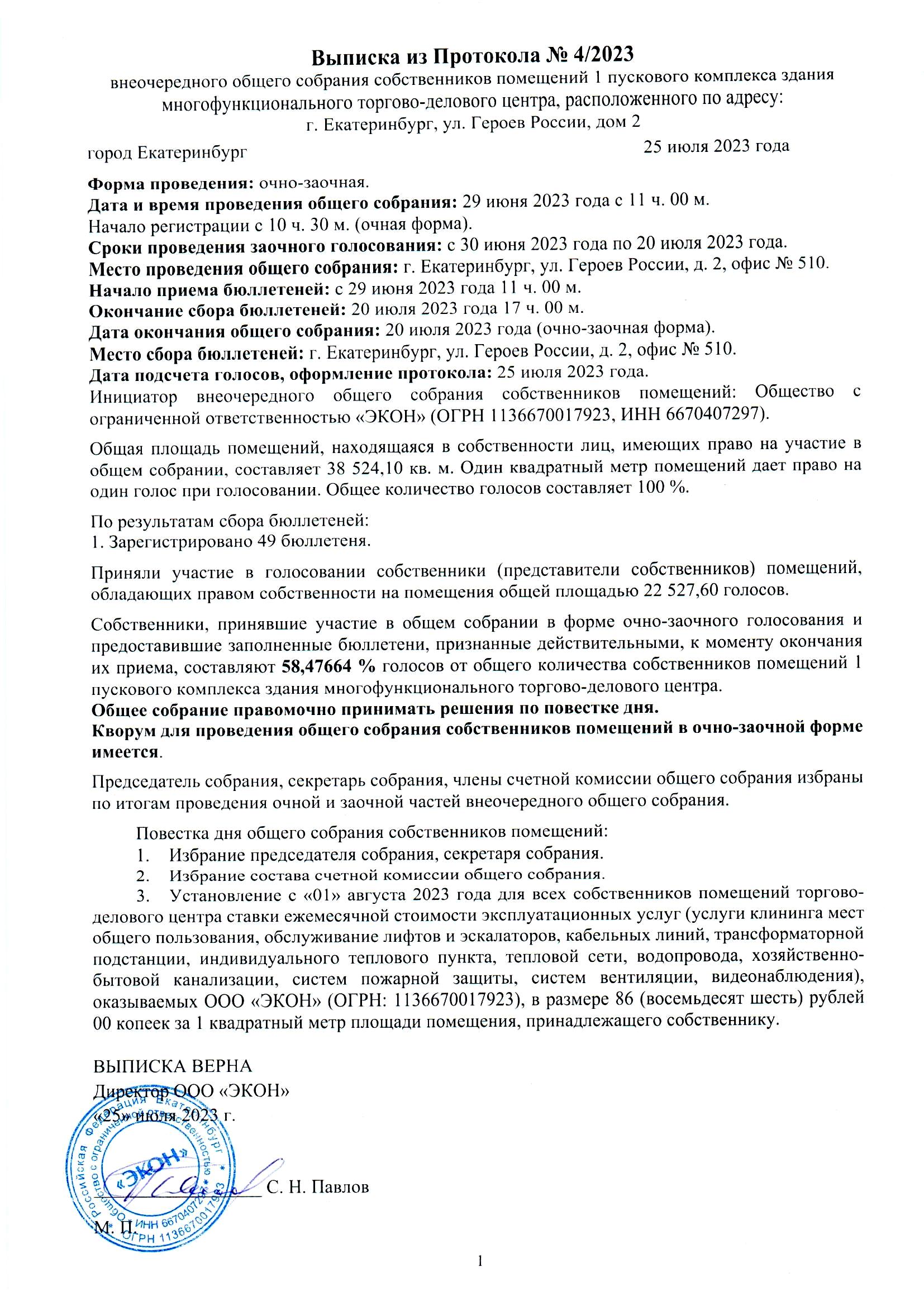 Проведено внеочередное общее собрание собственников помещений 1 пускового комплекса здания многофункционального торгово-делового центра, расположенного по адресу: г. Екатеринбург, ул. Героев России, дом 2.