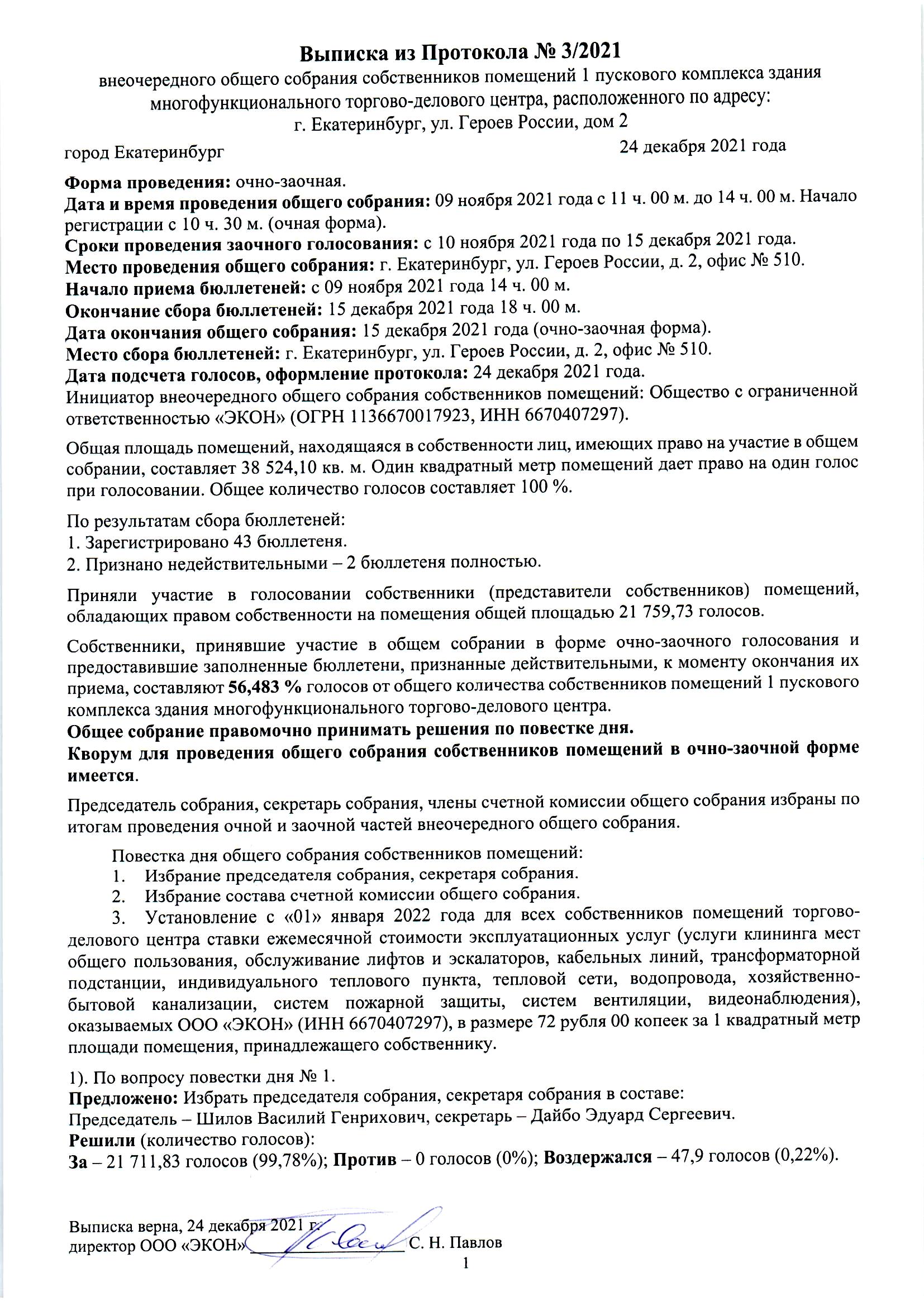 Проведено внеочередное общее собрание собственников помещений 1 пускового комплекса здания многофункционального торгово-делового центра, расположенного по адресу: г. Екатеринбург, ул. Героев России, дом 2.